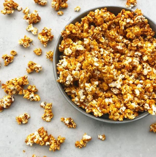 start med at koge brun farin, smør, og glukosesirup sammen i 4 min. Når den er kogt, slukkes for varmen og natron og vanilje tilsættes. karamellen skummer op når du tilsætter natron, men popcornene tilsættes deri. og røres godt igennem.